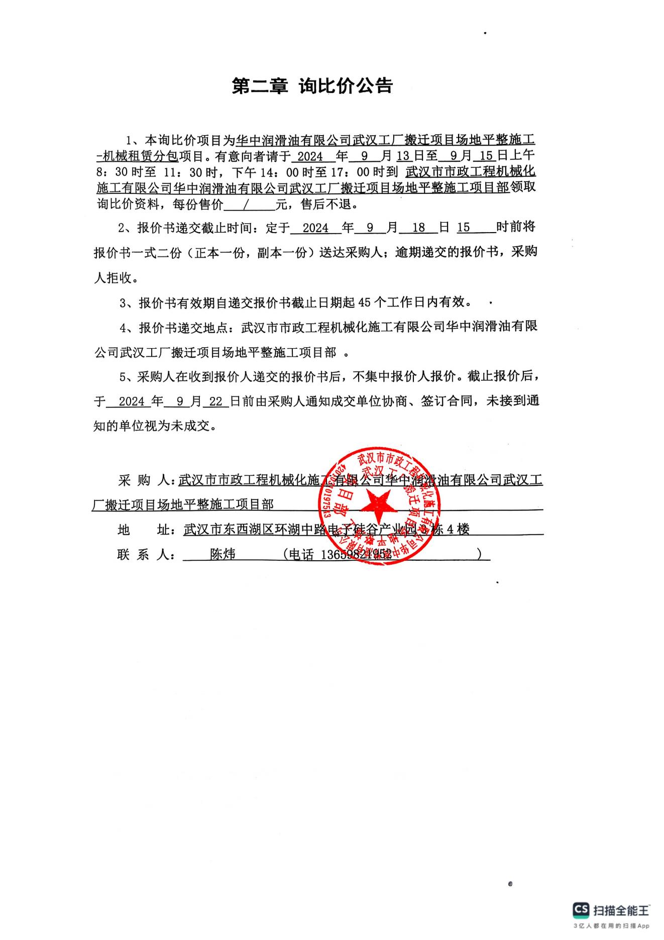 華中潤滑油有限公司武漢工廠搬遷項且場地平整施工機械租賃分包詢價公告