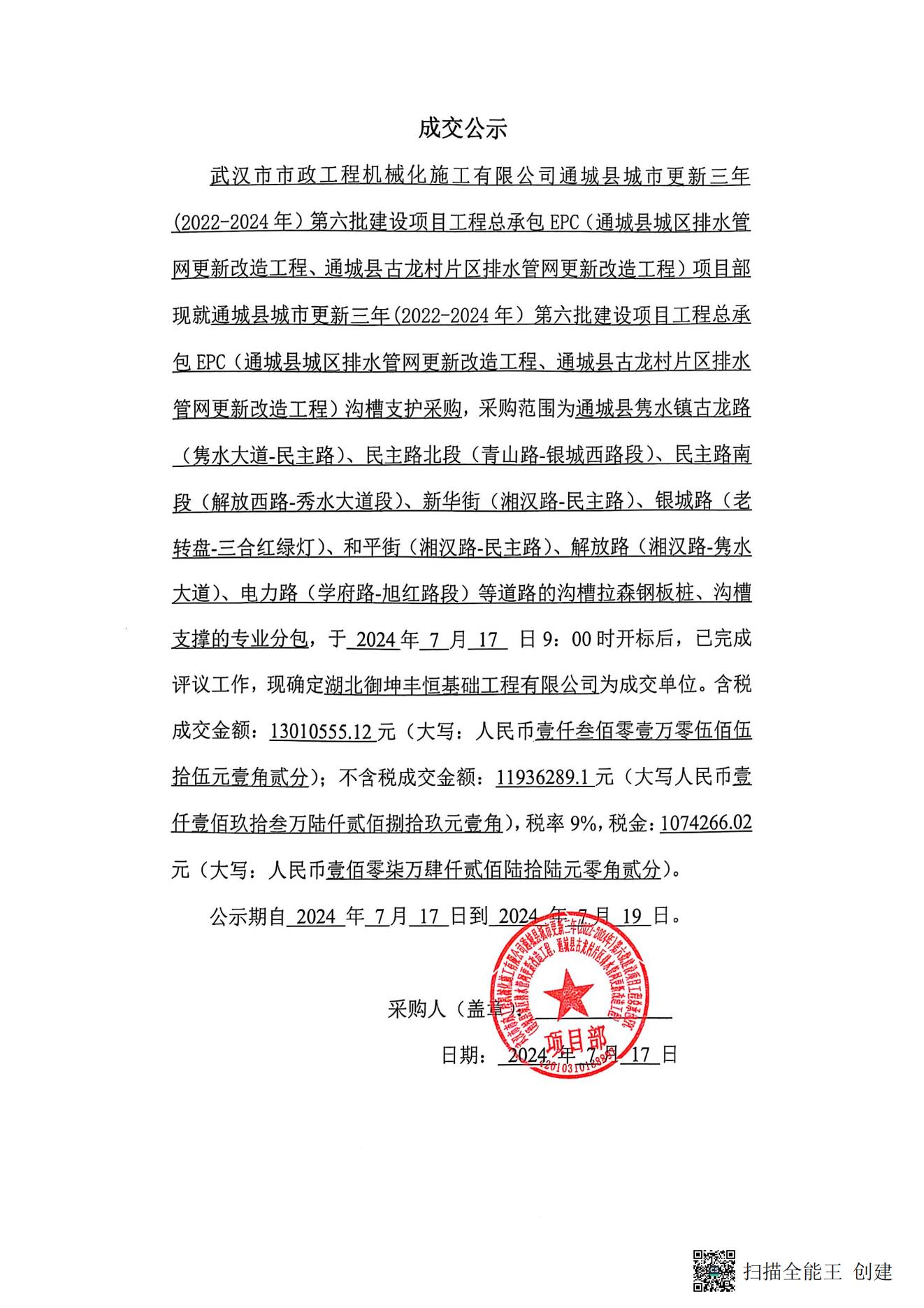 通城縣城市更新三年(2022-2024年)第六批建設項目工程總承包EPC(通城縣城區(qū)排水管網更新改造工程、通城縣古龍村片區(qū)排水管網更新改造工程)工程溝槽支護工程成交公示